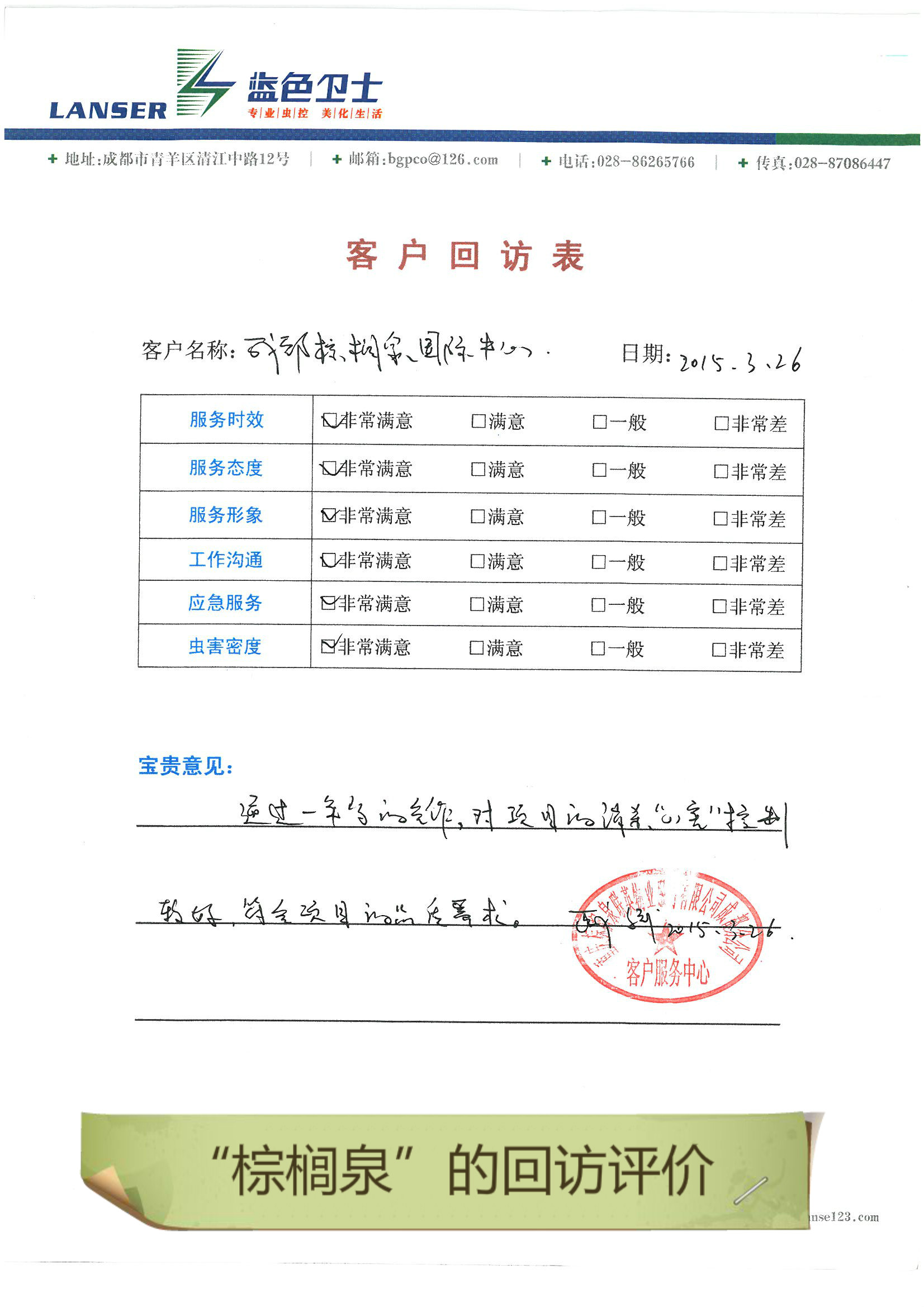 通過合作,對四害的消殺控制的很好,符合項目品質要求!